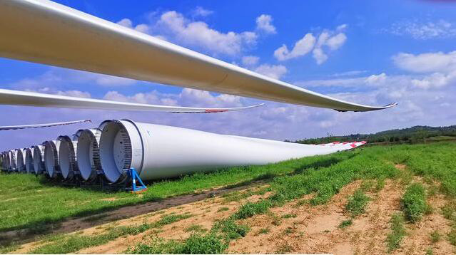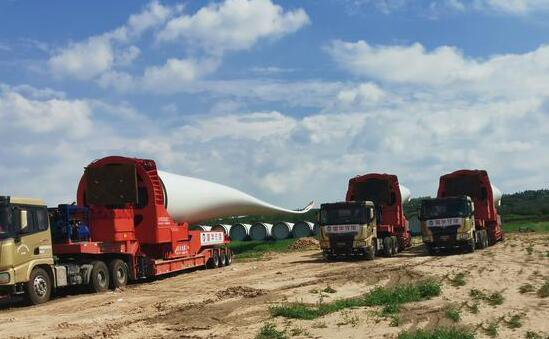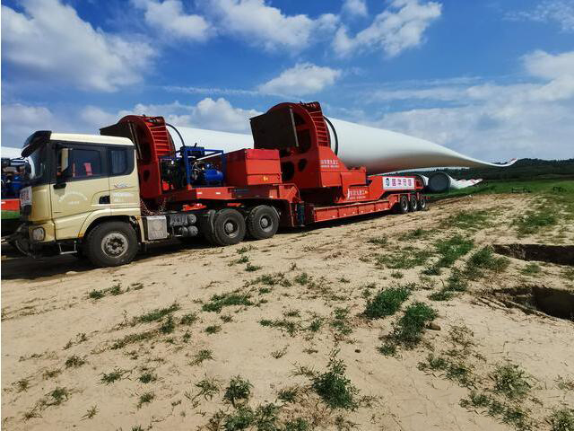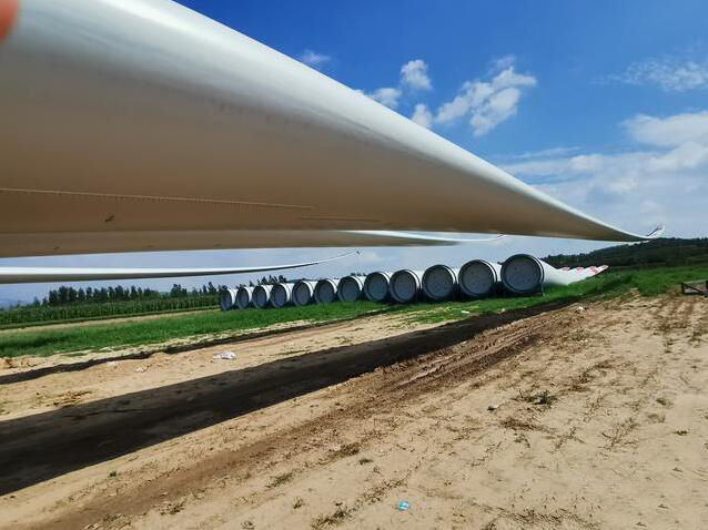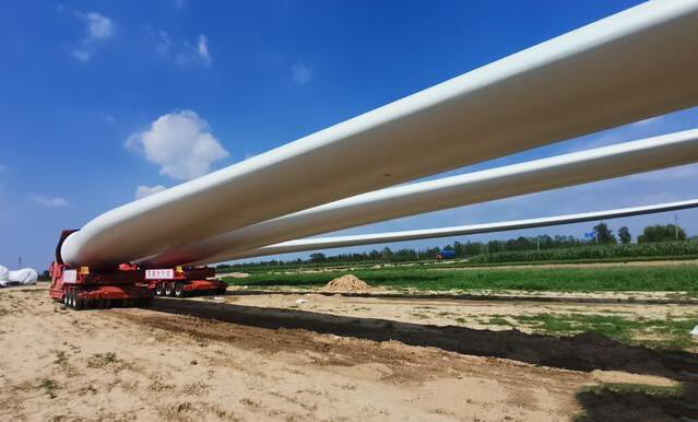 這些卡車上拉著的很大、很長、像飛機(jī)翅膀一樣的龐然大物就是風(fēng)力發(fā)電機(jī)的葉輪,就是我們所說的葉片??傞L度60多米,二十多噸重。